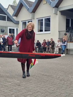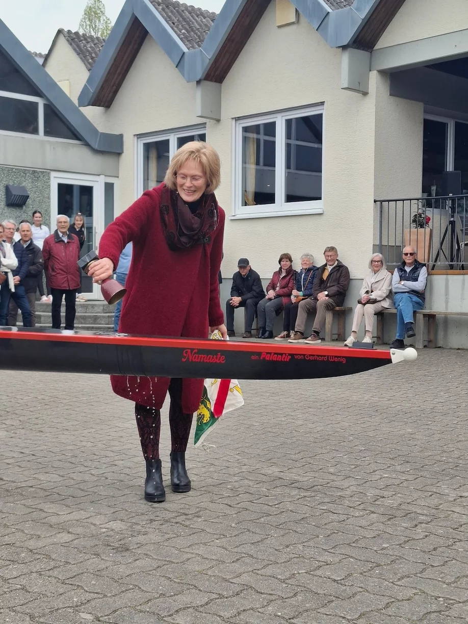 Beim Anrudern standen neben der offiziellen Bootsauffahrt auf dem Wasser noch zwei besonderere Momente an: Ein neuer Einer von Susanne Hradetzky wurde feierlich auf den Namen „Namaste“ getauft. Außerdem wurden noch drei Mitglieder nachträglich für langjährige Mitgliedschaft geehrt. Michael Scheuermann und Bernhard Fuchsbauer bekamen ihre Urkunden als Ehrenmitglieder (60 Jahre Mitgliedschaft) und Volker Wenzel erhielt für 40 Jahre die Goldene Vereinsnadel. Darüber hinaus wurden Fahrtenabzeichen und Sportabzeichen an die erfolgreichen Ruderinnen und Ruderer überreicht.
